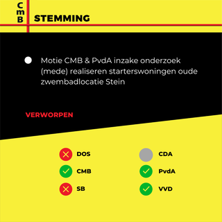Motie CMB & PvdA inzake Onderzoek (mede) Realiseren Starterswoningen Oude Zwembadlocatie Stein Verworpen